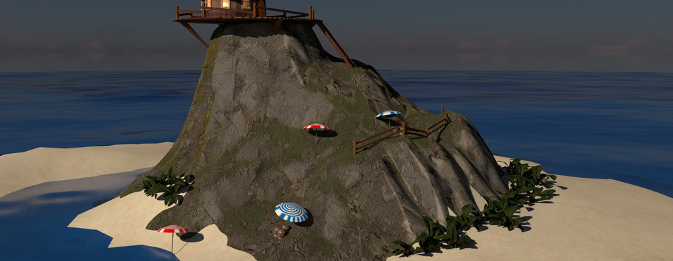 Now was the time where I needed to start creating my final models to get ready for texturing. The first challenge I needed to solve was how to create a realistic looking island or mountain. I wanted to create something similar to the large rock in the concept images. I was able to find a displacement map of a mountain online that I was able to turn into a brush. I used that to basically draw the kind of island I wanted. This worked wonders and so much better than I thought. This gave me a lot of confidence to keep going because what I thought was going to be the hardest part was over within 20 minutes. Next I started on the large deck that was going to be on top of the island. I just beveled some long rectangles and then built it like a real deck, board by board. I laid some support beams and modeled the fence post bits around the deck. The mountain I had created has a natural slope down to what was going to be the beach area. I used this to make a fence along the slope do that it would look like a place for people to walk. I modeled some barrels and umbrellas to give the place some signs of life. The house was also not too hard to model, I used a low poly cylinder to represent the structure of the wood beams, and a cone for the roof with wood slats to also show structure.